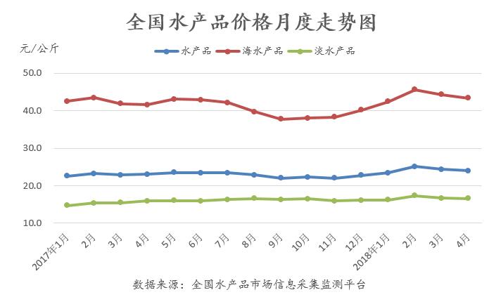 據(jù)對全國80家水產(chǎn)品批發(fā)市場成交價格情況監(jiān)測統(tǒng)計,4月份全國水產(chǎn)品綜合平均價格為24.01元/公斤,環(huán)比下降1.35%,同比上漲4.32%。其中,海水產(chǎn)品價格為43.43元/公斤,環(huán)比下跌2.06%,同比上漲4.42%;淡水產(chǎn)品價格為16.59元/公斤,環(huán)比下跌0.44%,同比上漲4.14%。