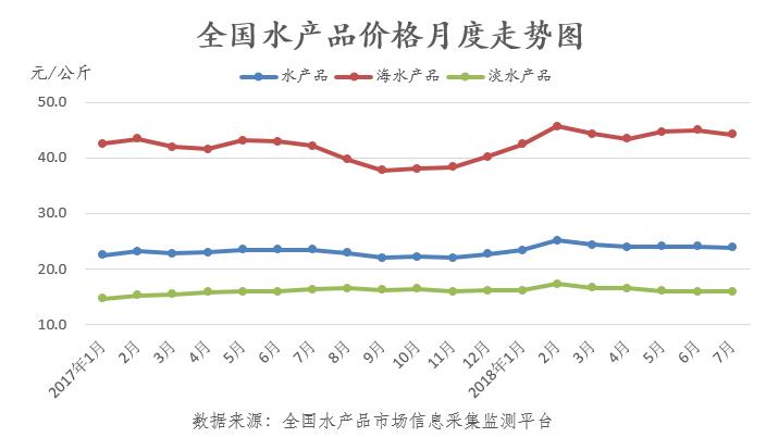 據(jù)對全國80家水產(chǎn)品批發(fā)市場成交價格情況監(jiān)測統(tǒng)計,7月份全國水產(chǎn)品綜合平均價格為23.87元/公斤,環(huán)比下跌0.90%,同比上漲1.74%。其中,海水產(chǎn)品價格為44.19元/公斤,環(huán)比下跌1.68%,同比上漲4.83%;淡水產(chǎn)品價格為16.00元/公斤,環(huán)比上漲0.18%,同比下跌2.18%。