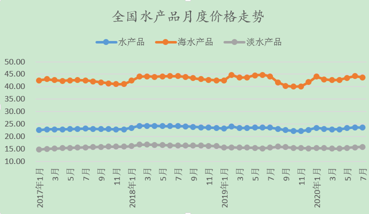7月份,海水產品價格43.75元/公斤,環比下降1.16%,同比下降0.96%。