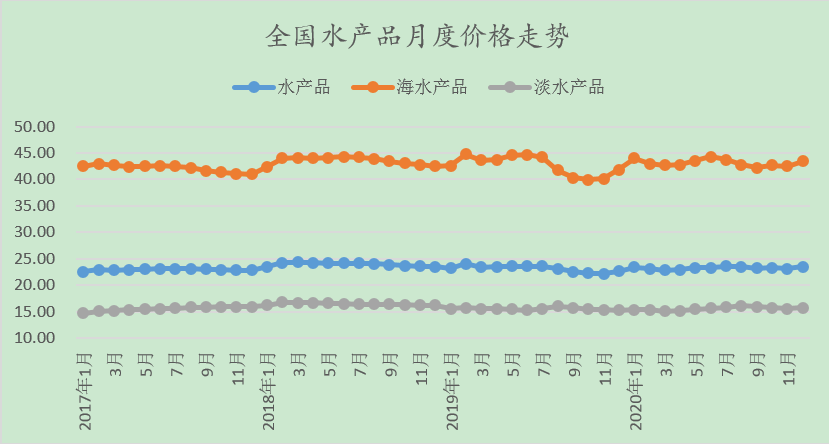 12月份,海水產品價格43.48元/公斤,環(huán)比上漲2.26%,同比上漲3.91%。