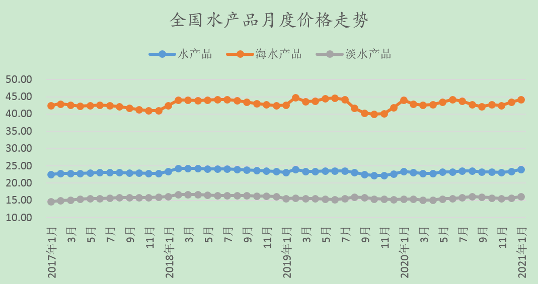 1月份,海水產(chǎn)品價(jià)格44.21元/公斤,環(huán)比上漲1.69%,同比上漲0.41%。