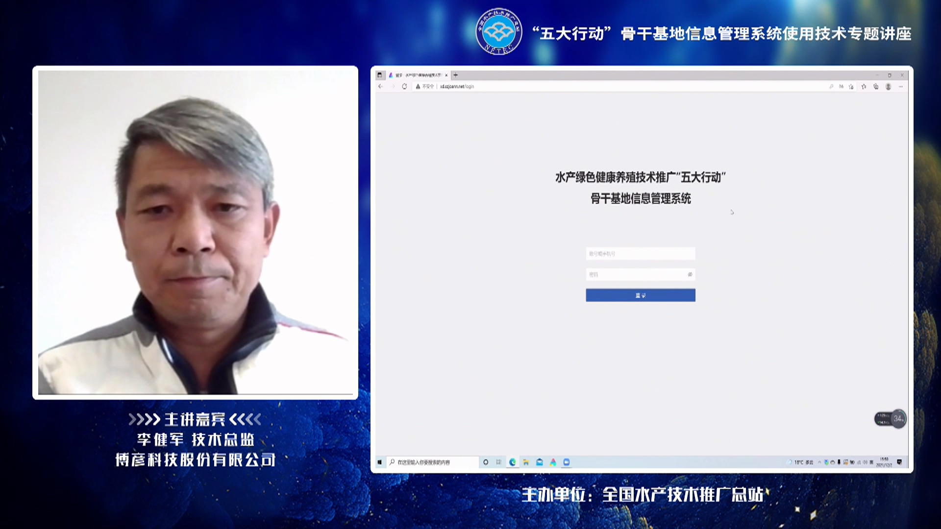 水產(chǎn)綠色健康養(yǎng)殖技術(shù)推廣“五大行動(dòng)”是推進(jìn)水產(chǎn)養(yǎng)殖業(yè)綠色高質(zhì)量發(fā)展的重要抓手,也是“十四五”期間水產(chǎn)技術(shù)推廣工作的重要內(nèi)容。為配合做好2021年度水產(chǎn)綠色健康養(yǎng)殖技術(shù)推廣“五大行動(dòng)”骨干基地認(rèn)定工作,指導(dǎo)各地順利使用水產(chǎn)綠色健康養(yǎng)殖技術(shù)推廣“五大行動(dòng)”骨干基地信息管理系統(tǒng),全國(guó)水產(chǎn)技術(shù)推廣總站12月2日舉辦了線上“五大行動(dòng)”骨干基地信息管理系統(tǒng)使用技術(shù)專題講座,邀請(qǐng)“五大行動(dòng)”骨干基地信息管理系統(tǒng)開發(fā)者——博彥科技股份有限公司技術(shù)總監(jiān)李健軍授課講解。